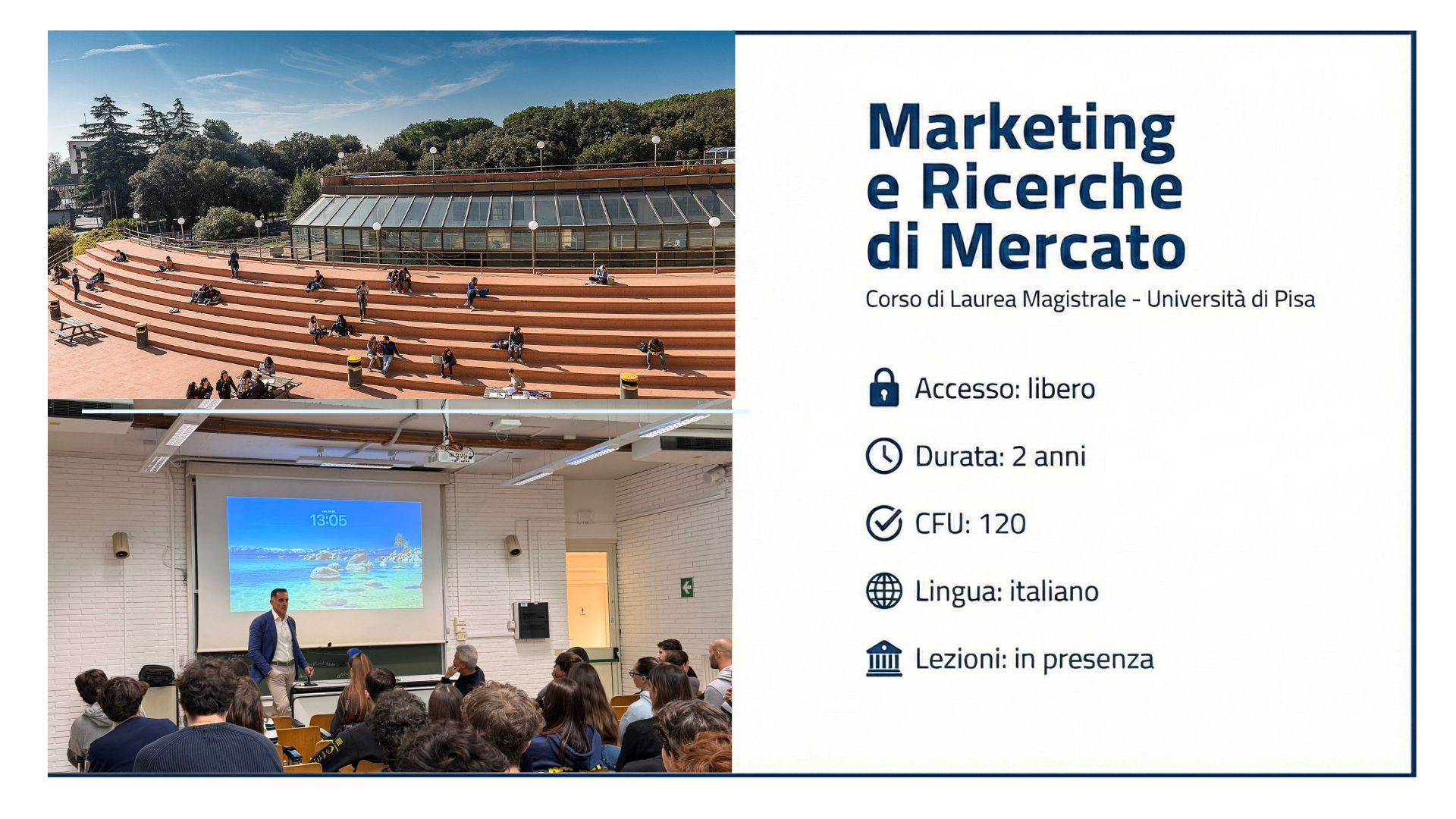 Il percorso è unico e integrato: non troverai curricula separati, perché crediamo che marketing e ricerca debbano camminare insieme. Chi lavora nel marketing ha bisogno di leggere i dati con rigore; chi si occupa di ricerche di mercato deve conoscere profondamente le logiche del marketing in cui i dati raccolti e analizzati saranno applicati.